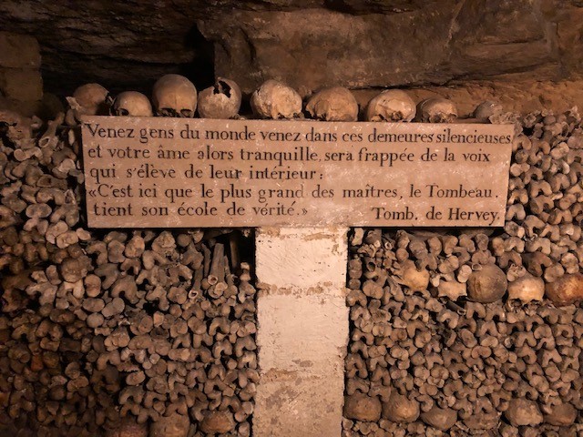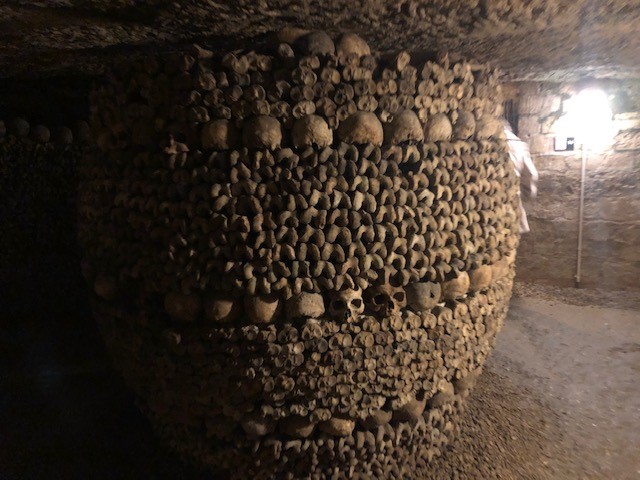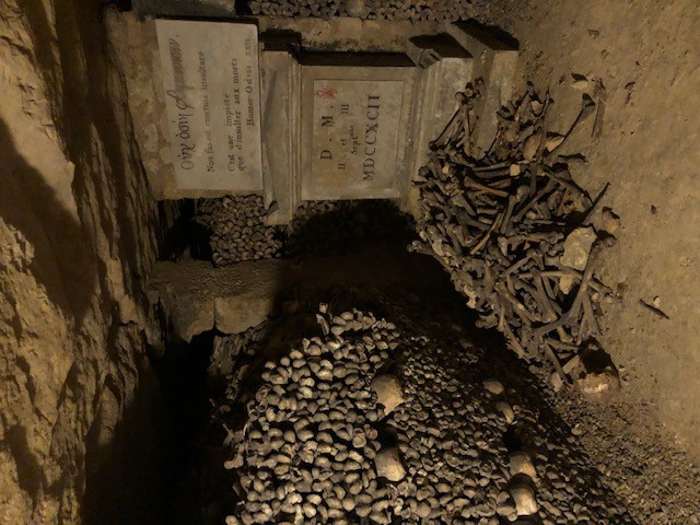 So now we make our way to 1770 with a tale of a pub owner asking his daughter to go into the basement to fetch some wine, when the daughter didn’t come back he went to check on her only to discover the wall had broke and the girl was buried under a mix of dirt and skeletons with the only her hand holding the pitcher of wine above the ground. It was also said at this time that if you touched the walls of the cemetery you would actually get gang green. Not only that but the people of Paris discovered the king had known for YEARS that people in a nearby underground market were having a horrible time as their crops and meats were going bad in a matter of hours and no one had any explanation. But the explanation was that there were far too many bodies decomposing in the cemetery so all burials inside the city are stopped. Now, around this time a man named Crosby became the chief of police and was charged with the task of figuring out what to do with this massive cemetery problem at the same time this other man Guirimo (honestly I’m not sure how to spell it) was in charge of the tunnels and the two got together and realized one had a body problem and the other had an empty tunnel problem so the two made a place to get the 6-7 million people buried moved into the catacombs. For some perspective there are currently 2.8m currently in Paris.