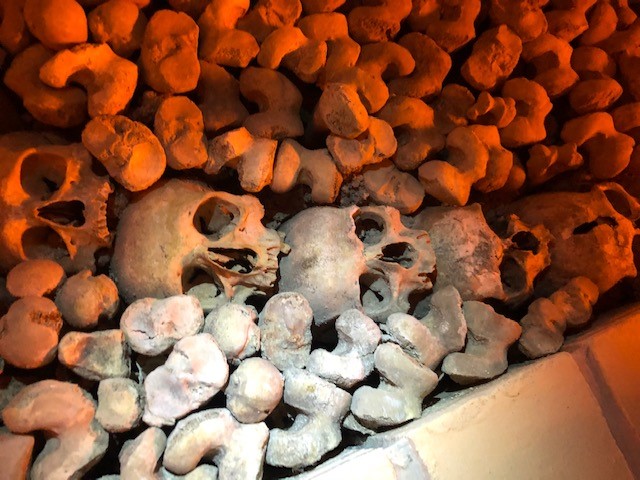 So, for the first 24 years bodies were just dumped down into piles. Arranged by whichever cemetery they came out of, so your body was put together but it would be placed in the same kind of general area. In 1810 a bone architect was hired and the stacking of bones began. Skulls and femurs were good staking bones which is most of what you will see when you walk around underground that’s most of what you see and all the other bones are thrown behind those skeleton walls. The designs created by the bones in many places, such as hearts or crosses or churches, different line designs, extra were all done by bored bone stackers, Cult of science and reason which was very popular at that time often represented by the obelus which can be found on pillars in between the bones.